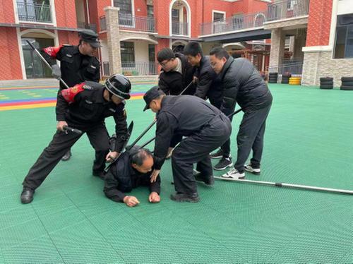 學(xué)校迅速啟動(dòng)反恐防暴應(yīng)急方案,學(xué)生在老師的組織下,全部迅速撤離到就近教室,躲在教室的角落等隱蔽地方,老師立即關(guān)閉門、窗,將桌椅等障礙物放置門后,并手持防暴棍以防歹徒進(jìn)入。與此同時(shí),學(xué)校應(yīng)急處置組立即上前與“歹徒”展開搏斗,五分鐘后將“暴恐分子”成功制服并帶離現(xiàn)場。