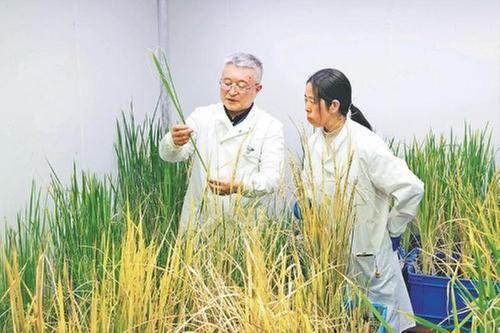 圖為3月18日,在中國科學(xué)院分子植物科學(xué)卓越創(chuàng)新中心溫室,韓斌院士(左)和呂丹鳳高級工程師交流水稻植株生長情況。