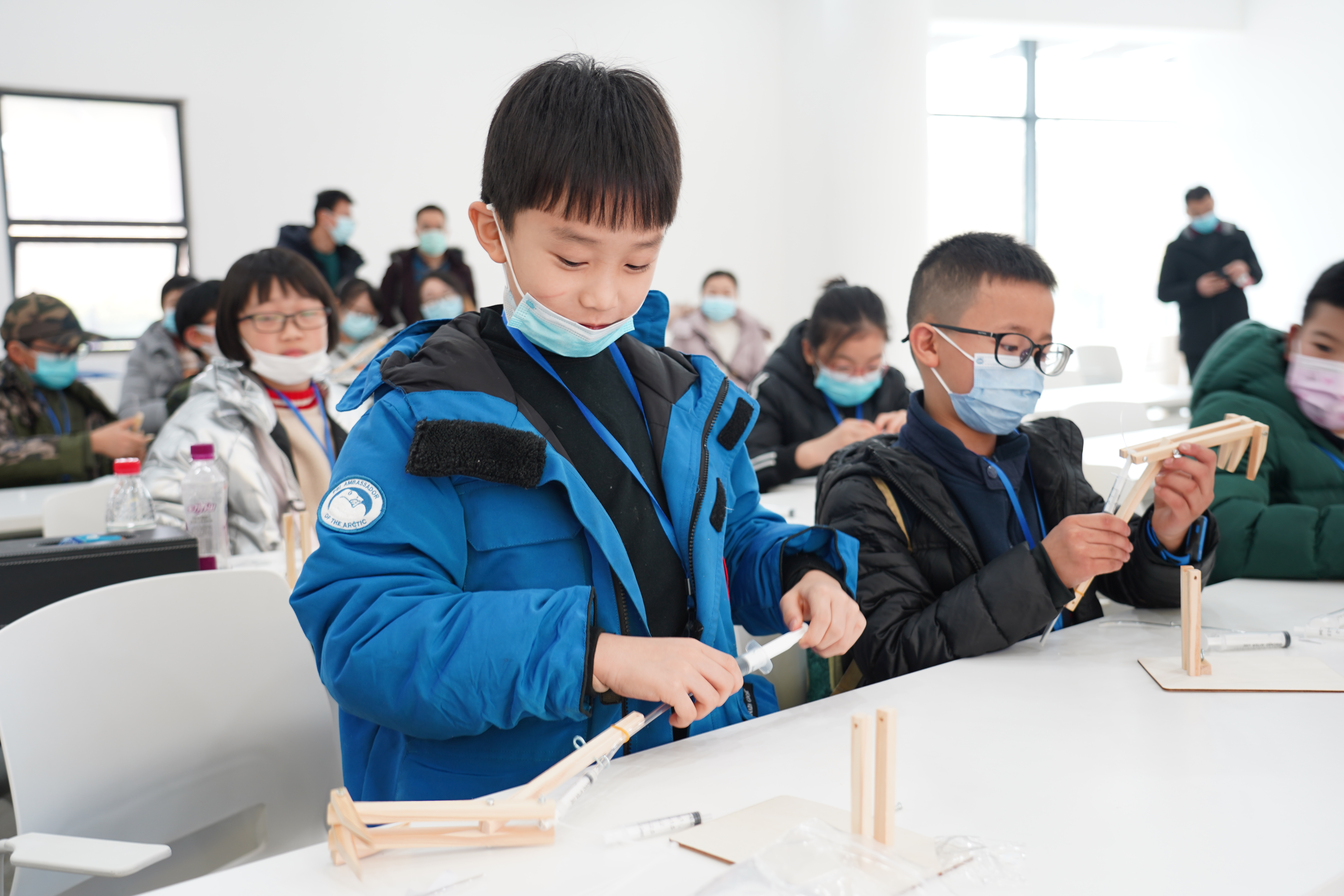 初識(shí)機(jī)器人的魅力后,小記者們按捺不住,紛紛開始動(dòng)手嘗試制作“機(jī)器人”。“機(jī)械臂因其獨(dú)特的操作靈活性,在工業(yè)裝配、安全防爆等領(lǐng)域得到了廣泛的應(yīng)用。”在老師的講解下,小記者們了解了機(jī)械臂的簡易構(gòu)建模型和液壓原理,利用小木條、注射器、塑膠管、橡皮筋、螺絲釘?shù)炔牧希谱髁艘豢詈唵蔚囊簤?ldquo;機(jī)械臂”。