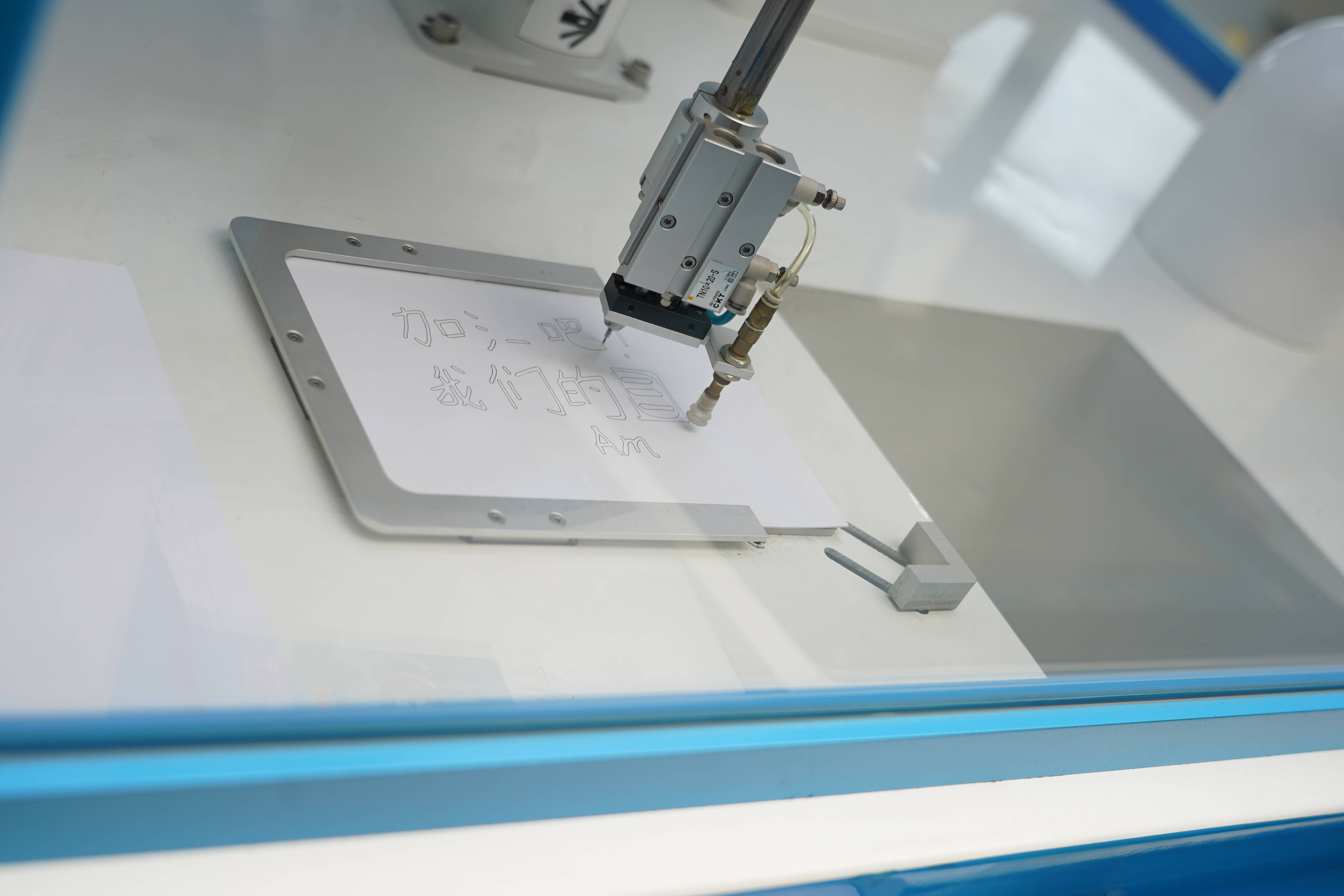同樣給小記者留下深刻印象的,還有“你寫我畫”機(jī)器人。在這臺(tái)可以按照指示畫畫的機(jī)器人前,小記者范思洋在觸屏畫板上寫下了“加油”。“因?yàn)檫@次期末考試我考得不是很理想,所以就想寫個(gè)‘加油’鼓勵(lì)自己。”拿著機(jī)器人復(fù)刻出的“加油”圖畫,范思洋露出了微笑。