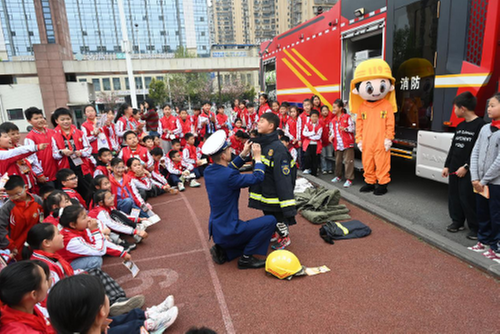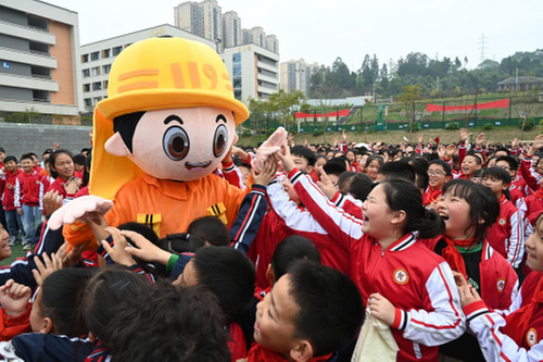 3月27日,在內(nèi)江市東興區(qū)牛牦山小學(xué),消防員穿戴卡通人偶服飾向?qū)W生們宣傳消防安全知識(shí)。