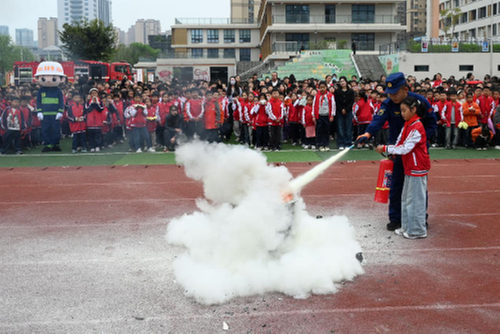 3月27日,在內(nèi)江市東興區(qū)牛牦山小學(xué),學(xué)生正在消防員的指導(dǎo)下使用干粉滅火器滅火。