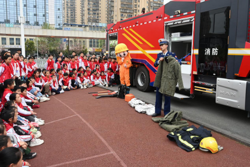 3月27日,在內(nèi)江市東興區(qū)牛牦山小學(xué),消防員正在向?qū)W生介紹消防裝備。