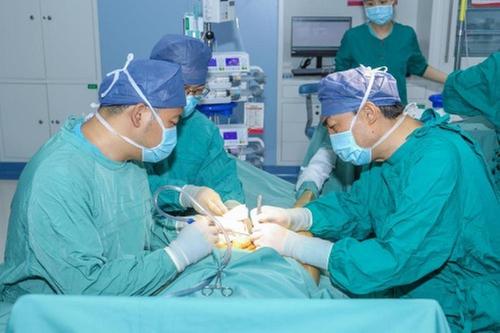 西安國際醫(yī)學(xué)中心醫(yī)院整形醫(yī)院院長郭樹忠教授(右)及其團(tuán)隊(duì)手術(shù)中