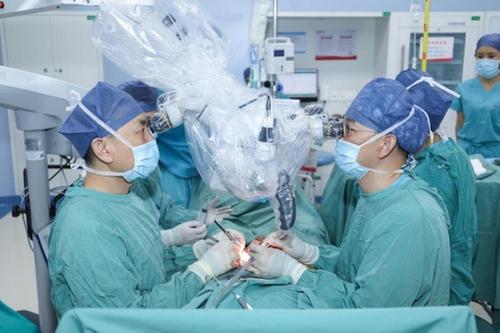 手術(shù)臺上,王愛武主任、籍建華主任通過放大幾十倍的顯微鏡,用雙手將細(xì)到肉眼幾乎看不見的線,與血管一點(diǎn)一點(diǎn)地進(jìn)行著縫合、吻接。