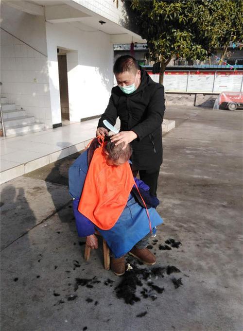 蘇長華為敬老院老人理發(fā)