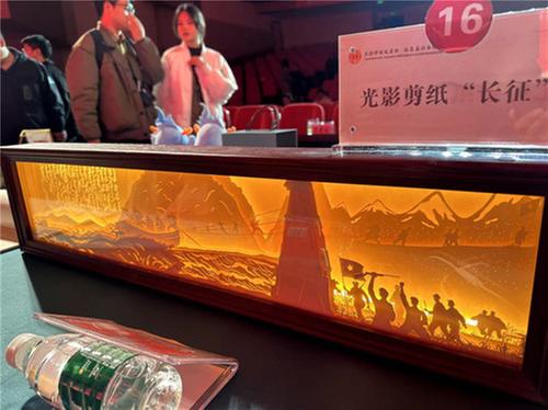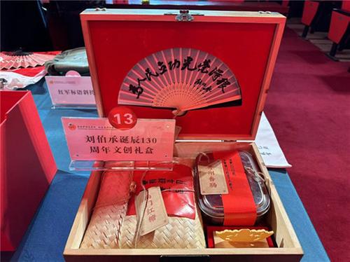 評比過程中,由資陽市樂至縣總工會推薦的文創(chuàng)作品《耕讀四件套》格外顯眼。本套產品被評為“2022年資陽市天府旅游名品”,以陳毅元帥家的祖訓為立足點開發(fā)設計而成,包含筆記本、簽字筆、書簽、書扣,承載著對當代青年“腹有詩書氣自華”的希冀。由雁江區(qū)總工會推薦的《光影剪紙·長征》,作品長80厘米,寬20厘米,融入了長征中飛奪瀘定橋、四渡赤水、爬雪山過草地的故事,通過立體的剪裁和燈光照射結合,巧妙地傳播了長征精神。由重慶開州區(qū)總工會推薦的《劉伯承誕辰130周年文創(chuàng)禮盒》,由重慶市工藝美術大師楊藝創(chuàng)作,作品將紅色文化和非遺剪紙相結合,具有較高的藝術收藏價值。