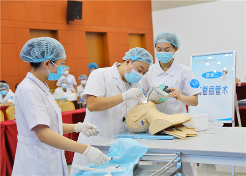 隨后,進(jìn)行了心肺復(fù)蘇術(shù)+電除顫術(shù)、氣管插管術(shù)和穿脫防護(hù)服三項技能操作競賽。參賽隊員根據(jù)所給案例,對“患者”進(jìn)行現(xiàn)場評估,并采取及時正確的搶救措施;以及根據(jù)案例相關(guān)要求做好個人防護(hù)。