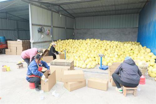 (喬家鎮(zhèn)廖壩村安佛蜜柚專業(yè)合作社內,工人們正在將柚子按照客戶要求裝箱,準備發(fā)往全國各地。)