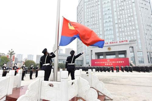 “慶?;顒?dòng)現(xiàn)在開(kāi)始。”隨著現(xiàn)場(chǎng)指揮口令下達(dá),3名身著警禮服的升旗手護(hù)送警旗,邁著鏗鏘有力的步伐走到升旗臺(tái)前,展開(kāi)旗幟,掛上旗桿。