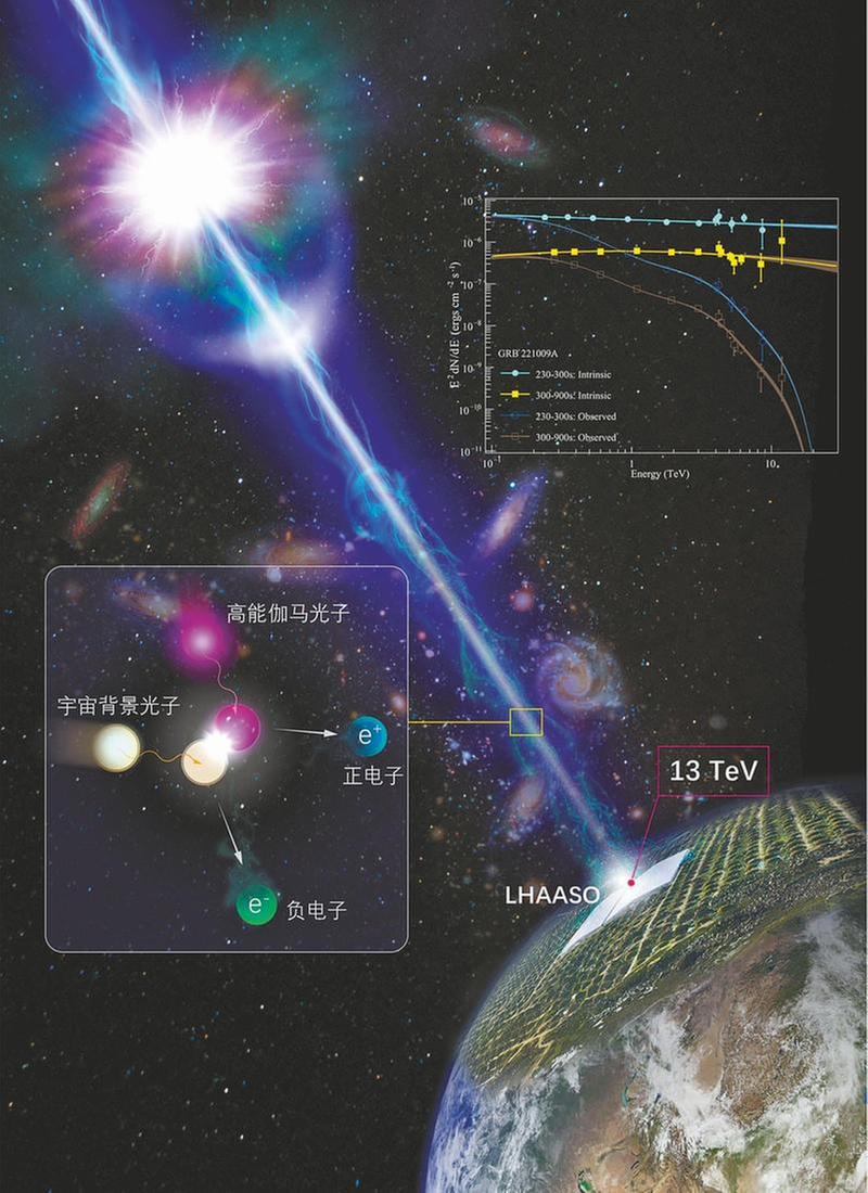 中國(guó)科學(xué)院高能物理研究所研究員畢效軍介紹,宇宙中的恒星會(huì)向外發(fā)光,這些恒星發(fā)射出來(lái)的光不會(huì)憑空消失掉,而是會(huì)“彌散”在整個(gè)宇宙中,會(huì)形成一種類似“迷霧”,這就是宇宙的背景光。宇宙背景光是宇宙中不同距離處所有的星系輻射產(chǎn)物的總和,與宇宙演化密切相關(guān)。而高能伽馬光子在飛行時(shí)會(huì)被宇宙中彌漫的背景光吸收。在傳統(tǒng)理論中,伽馬光子能量越高被吸收得越強(qiáng)烈,這就是拉索能夠探測(cè)到來(lái)自銀河系內(nèi)天體的PeV(1 PeV=1000TeV)伽馬光子,卻很難探測(cè)到來(lái)自遙遠(yuǎn)伽馬暴10TeV光子的原因。反過(guò)來(lái),根據(jù)伽馬射線被吸收的程度,也可以研究宇宙背景光的強(qiáng)度與性質(zhì)。“本次探測(cè)到的伽馬暴的極高亮度使我們有機(jī)會(huì)探測(cè)到來(lái)自24億光年外宇宙深處所產(chǎn)生的高能伽馬光子。按照目前的宇宙演化模型,1 TeV伽馬光子飛行24億光年被背景光吸收的概率約為80%,而10 TeV伽馬光子被吸收的概率則超過(guò)99.5%。但我們這次探測(cè)到的伽馬光子,被宇宙背景光吸收的僅占預(yù)期的40%左右,這是一個(gè)非常重要的發(fā)現(xiàn)。” 畢效軍說(shuō)。