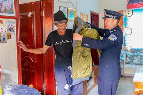 接下來是進(jìn)村入戶,語言不通,與群眾說不上話,交不上心,仿佛彼此都是聾啞人,但又不懂手勢語言,大家都懵在那兒無所適從。但每天到村委會看到飄揚(yáng)的紅旗,心中的惆悵頓消,“一名黨員一面旗幟”,有種力量驅(qū)使黨員楊江山認(rèn)真工作。一條小河從河谷中心流過,灌溉著河谷兩旁的農(nóng)作物和青草地,養(yǎng)育著成群的牛羊和牲畜。當(dāng)在村干部帶領(lǐng)下第一次看望貧困戶支布子合時,楊江山更加堅定了留下來扶貧幫困的決心。這個50多歲的跛腳男人,一個政府幫扶修建的漂亮小院里,住房整潔而不失煙火氣,盛放著收獲的5000余斤土豆、2000余斤玉米,還飼養(yǎng)著一群牛羊。在政府的幫扶下,他用自己的雙手脫貧。因?yàn)楹庸壤锾鞖夂洌@次,楊江山給他們夫婦送來了厚厚的防寒服,還當(dāng)場為他們換衣服看大小是否合適。穿著舒適而溫暖的衣服,兩口子拉著楊江山笑得格外開心。