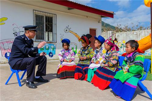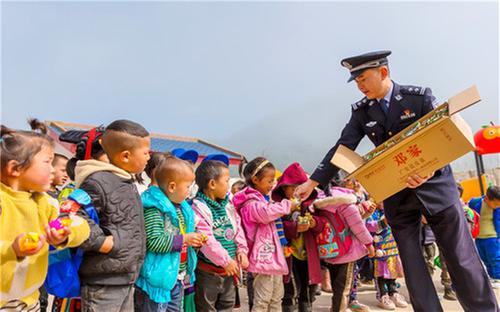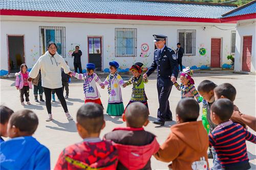 “國慶回廣安探親,我買了些家鄉(xiāng)特產(chǎn),今天要去村上幼兒園看望一下孩子們。”身著警服的他搬出幾大箱廣安特產(chǎn)“老鄧”鹽皮蛋和幾大袋五色糖果,在大家的幫助搬運(yùn)下,來到覺撒鄉(xiāng)馬依村保幼兒園。“我給孩子們帶了一些家鄉(xiāng)特產(chǎn),請他們分享一下我家鄉(xiāng)的美味兒。”楊江山對馬依村保幼兒園彝族女老師吉克伍牛說。一會兒,吉克老師指揮孩子們列隊歡迎。吉克老師依次給孩子們分發(fā)鹽皮蛋和糖果,孩子們興奮不已。楊江山站在隊列前,大聲地對孩子們說:“小朋友們,這次國慶節(jié)我回到家鄉(xiāng)廣安,給大家?guī)砑亦l(xiāng)特產(chǎn),請大家品嘗。你們都是新時代祖國的花朵,我們要養(yǎng)成愛清潔講衛(wèi)生的好習(xí)慣,吃糖果后,要把糖紙扔進(jìn)垃圾桶。最后,我要看看你們最近跟老師學(xué)的舞蹈,行嗎?”“謝謝楊警官,我們?yōu)槟欢蚊褡逦璧浮?rdquo;孩子們異口同聲。在歡快的音樂聲中,民警楊江山與孩子們跳起彝族民族舞蹈“達(dá)體舞”。吉克伍牛老師說:“楊警官每個月都要到幼兒園來,檢查園內(nèi)安全,給孩子們講故事,講毒品知識,講養(yǎng)成清潔衛(wèi)生好習(xí)慣,孩子們挺喜歡他的。小朋友們回家后,還要求家里人移風(fēng)易俗、講清潔愛衛(wèi)生。有他在,我們有一種莫名的安全感。”