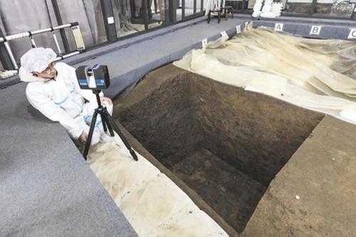 考古人員用三維激光掃描儀掃描三星堆7號祭祀坑