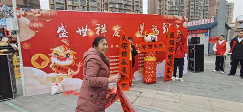 活動現(xiàn)場設(shè)置了科普宣傳區(qū)、寫福工作區(qū)、送福領(lǐng)取區(qū)、文藝活動區(qū)和義診區(qū)。主舞臺上特色舞龍表演、歌舞表演吸引了廣大眾群駐足觀看。書法老師們揮亳潑墨,用嫻熟的筆法書寫著新年祝福,“滿門如意隨春到, 一地吉祥逐龍來”“年年順意全家福,歲歲安寧滿宅春”……一幅幅散發(fā)著清新墨香的春聯(lián)和福字就呈現(xiàn)在大家眼前,濃濃的年味兒撲面而來。群眾們收到書法家親手書寫贈送的春聯(lián)和福字后,仔細(xì)端詳、喜上眉梢。