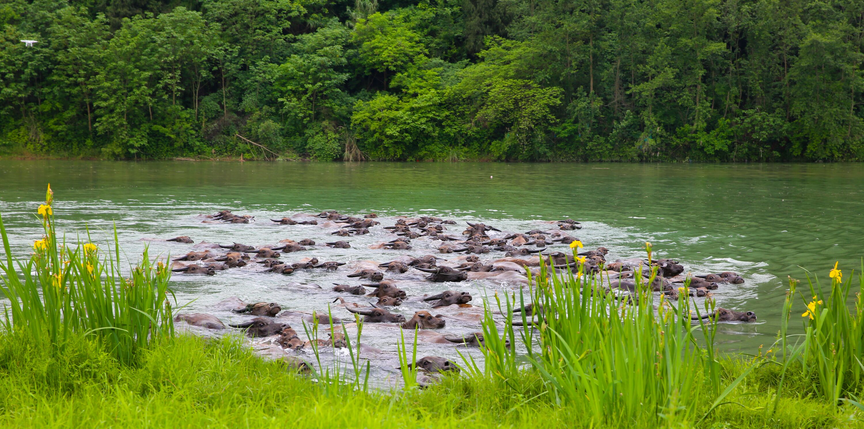 4月28日上午,南充市蓬安縣油房溝社區(qū),隨著柵欄門的開啟,上百頭牛兒浩浩蕩蕩沖向嘉陵江,奮力向水草豐茂的江心太陽島游去。在江中,牛兒們破浪前行,跳起“水上芭蕾”,登上太陽島歡快地啃食青草。百牛谷、百牛廊橋、望江樓碼頭等景點(diǎn)人頭攢動(dòng),上萬名游客駐足觀看百牛渡江場景,激動(dòng)地領(lǐng)略這一自然“生態(tài)奇觀”。