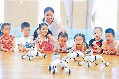 8月17日,樂山市金蘋果邦泰幼兒園,老師帶領(lǐng)孩子們與智能機(jī)器人“賓果”互動(dòng)交流。