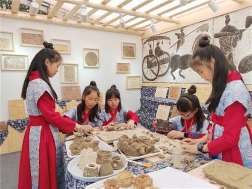 據(jù)悉,全市參加展示的工作坊共8個,各工作坊結(jié)合本土文化,巧妙構(gòu)思、大膽創(chuàng)新,可謂百花齊放、各具特色。“漢磚童繪”藝術(shù)實踐工作坊,靈感來源于全國重點文物保護單位——彭山江口漢崖墓博物館。墓內(nèi)的漢代畫像磚雕刻技藝頗為高超、精湛。
