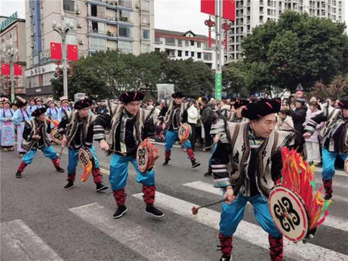活動現(xiàn)場,鑼鼓喧天,人潮涌動。巡游隊伍從縣城三彩廣場出發(fā),沿人民路、上正街來到洪雅廣場。巡游節(jié)目融入了大量非遺元素,省級非遺項目復興耍鑼鼓再現(xiàn)了傳統(tǒng)古村落復興村的羌風楚韻,跑旱船、打連簫、迎新娘、蚌殼燈、牛兒燈、龍燈等巡游表演精彩紛呈。