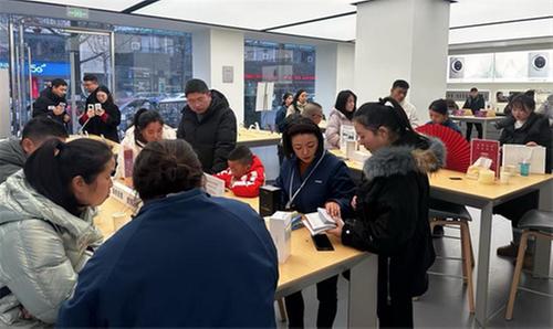 筆者在該縣城區(qū)人民路一家華為授權手機體驗店看到,店內(nèi)擺放著醒目的“國補”宣傳海報,柜臺前人頭攢動,前來咨詢“國補”政策和挑選手機的顧客絡繹不絕,店員們熟練地協(xié)助顧客用手機領取國補券碼。市民王磊剛入手一臺華為mate60,他說:“我之前看的價格是5999元,今天來合計了一下,國補500元加店補1000元,少了1500元,挺合適的。”