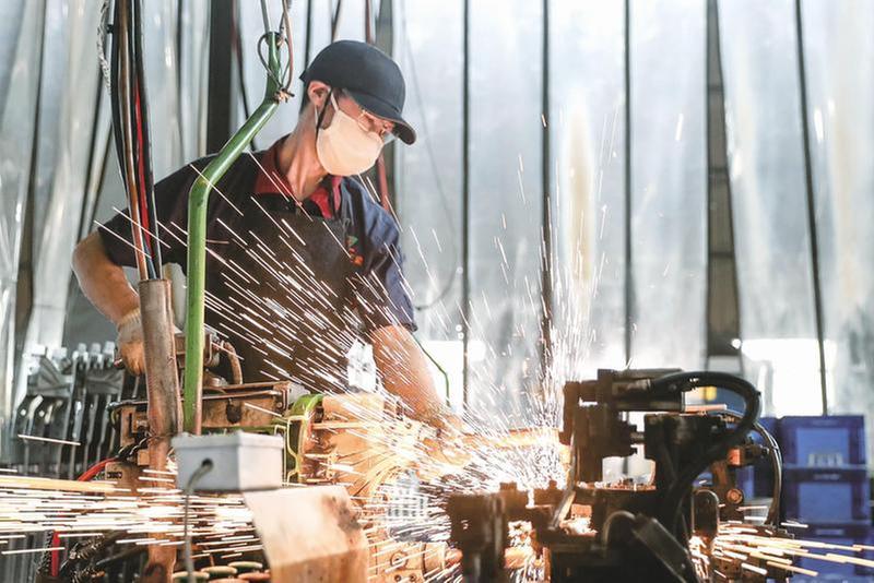 時(shí)值盛夏,廣安華鎣山經(jīng)開區(qū)各企業(yè)克服高溫酷熱天氣帶來的影響,采取輪班作業(yè)、錯(cuò)時(shí)作業(yè)等方式,開足馬力拼經(jīng)濟(jì)、抓生產(chǎn)、搶訂單,推進(jìn)全年生產(chǎn)經(jīng)營(yíng)目標(biāo)任務(wù)的實(shí)現(xiàn),促進(jìn)工業(yè)經(jīng)濟(jì)加速跑。圖為7月28日,華鎣山經(jīng)開區(qū)正梁機(jī)械加工廠的工人在焊花飛濺的高溫中加緊趕制與重慶、成都等地企業(yè)配套的機(jī)械產(chǎn)品,保障“訂單”需求。