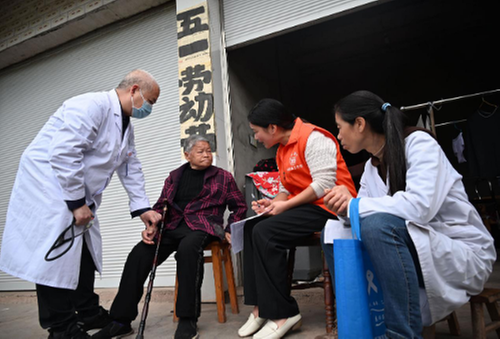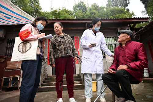 4月14日,在內(nèi)江市東興區(qū)楊家鎮(zhèn)鐵爐村,醫(yī)護(hù)人員為失能老年人提供健康科普服務(wù)。