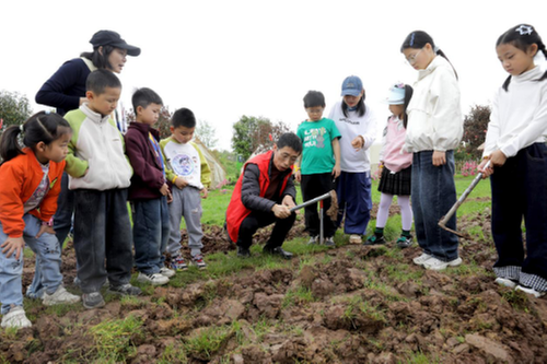 圖為:農(nóng)業(yè)技術(shù)人員向?qū)W生、幼兒示范講解松土播種知識(shí)。