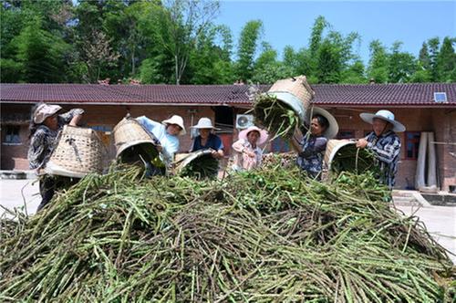5月23日,在內江市東興區(qū)高梁鎮(zhèn)方家溝村車前子種植基地,村民正忙著收獲和晾曬車前子。
