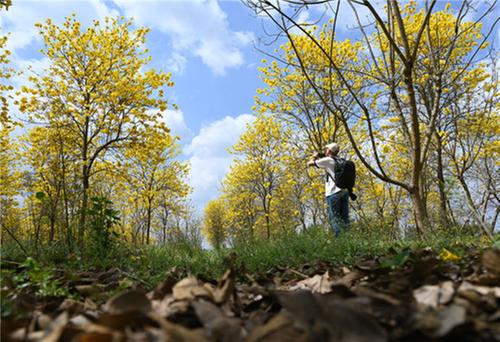 連日來,隨著氣溫回暖,內(nèi)江市東興區(qū)石子鎮(zhèn)太和村大片大片的黃花風(fēng)鈴木在春日陽光的沐浴下競相怒放,迎來一年中最美的季節(jié),吸引了當(dāng)?shù)厝罕姾痛ㄓ逯苓呌慰颓皝碣p花度假,打卡游玩。
