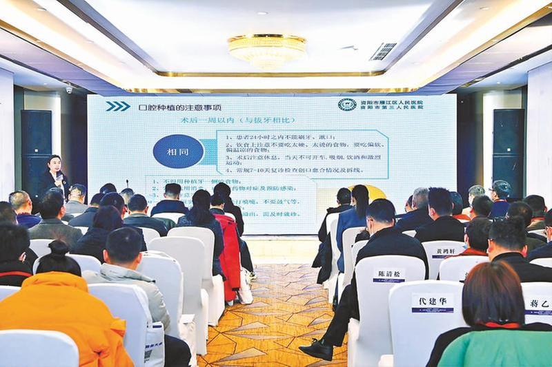 “種植牙包括三個(gè)部分,分別是種植體、基臺(tái)及其上部修復(fù)結(jié)構(gòu)。我們依托這種種植修復(fù)方式,可以恢復(fù)患者缺失牙或牙列的形態(tài)和功能的新型義齒。”走進(jìn)資陽路演活動(dòng)現(xiàn)場,資陽市雁江區(qū)人民醫(yī)院(資陽市第三人民醫(yī)院)口腔科副主任醫(yī)師付冬梅正在向與會(huì)嘉賓介紹口腔種植技術(shù),演示屏上是一張種植牙的模型圖。付冬梅介紹,該技術(shù)可以應(yīng)用于單顆牙缺失、多顆牙缺失以及全口牙缺失,它改變了傳統(tǒng)牙列缺損修復(fù)方式,具有防止缺牙后牙槽骨繼續(xù)萎縮、避免損傷真牙、美觀舒適的效果。