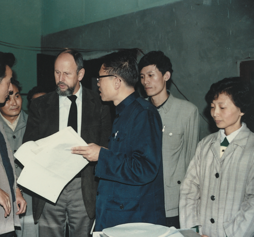 1982年著名齒輪專家德國慕尼黑大學(xué)溫特教授(右四)前來訪問,黃潼年(右三)介紹錐齒輪整體誤差測量技術(shù)